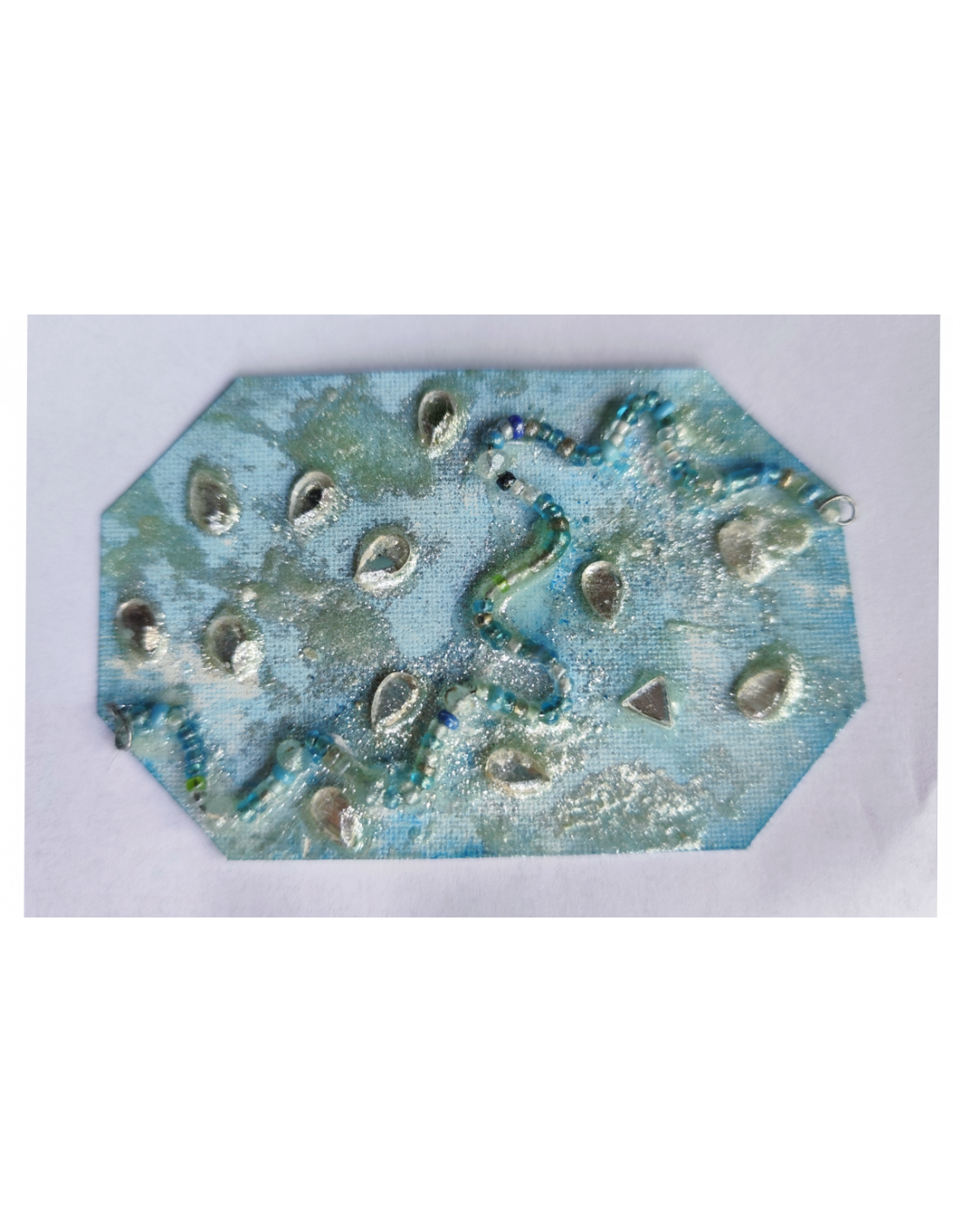 Acqua che brilla, nutre, rinfresca, porta via detriti, ma anche pensieri e ricordi negativi. Senza acqua la vita non può nemmeno essere pensata, le nostre radici sono nell'acqua... Siamo come mangrovie e ci dissetiamo alla fonte della vita. Materiali: acquerello, resina, perline di conteria, strass, pigmenti