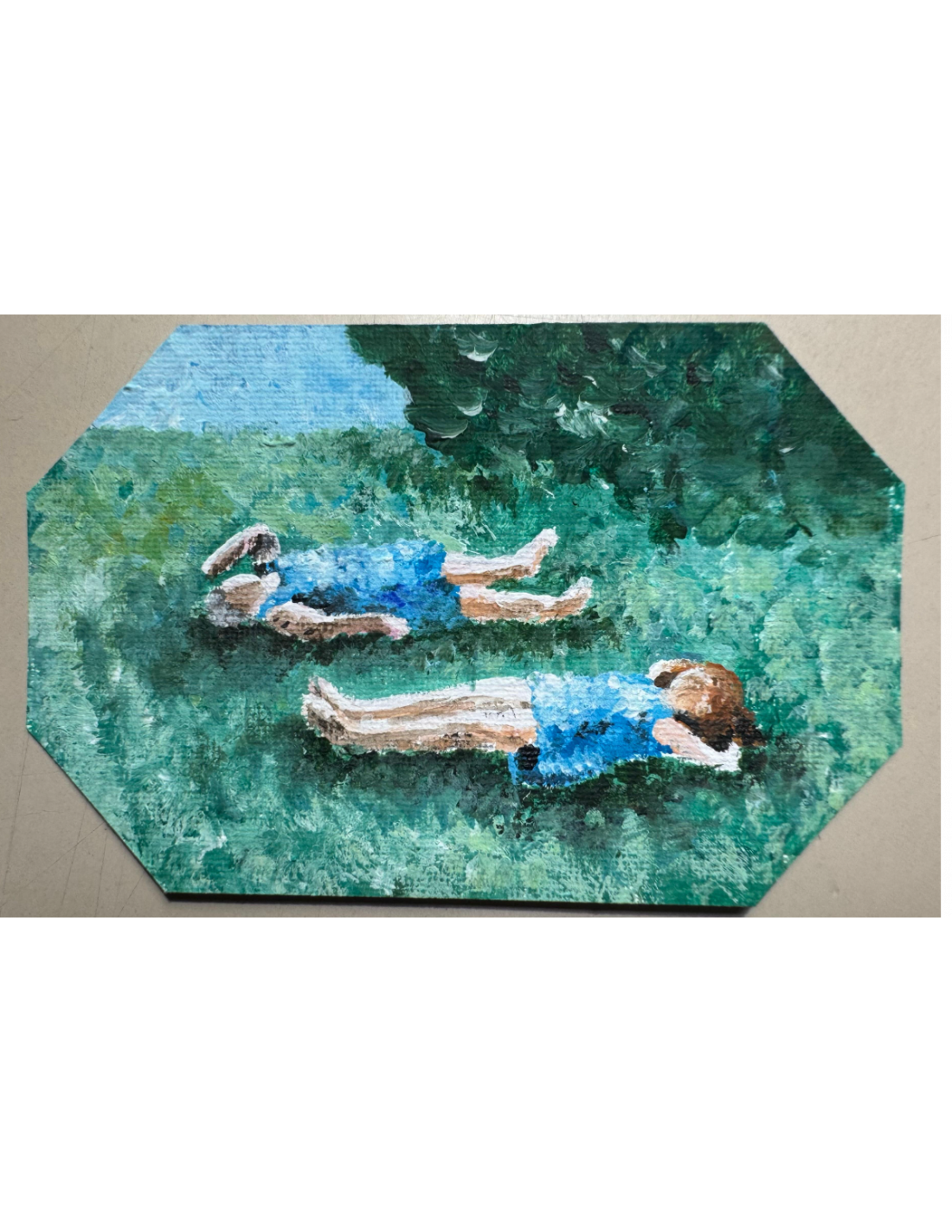Nella piccola tela prende vita un momento intimo e universale: una nonna e una nipote sdraiate sull'erba del giardino di casa. Distese una accanto all'altra, indossano semplici abiti azzurri che si fondono con il verde vibrante del prato, come a sottolineare il legame profondo con la natura circostante. L'opera restituisce la spontaneità di un sorriso silenzioso, fatto di complicità e di ascolto: il cielo, gli alberi e la terra diventano testimoni di un gesto semplice ma radicato, che riconnette alle origini e alla bellezza dell'essenziale. la pennellata fresca e luminosa cattura la gioia pura del contatto con la natura, evocando la continuità tra generazioni e il valore affettivo delle radici familiari.
